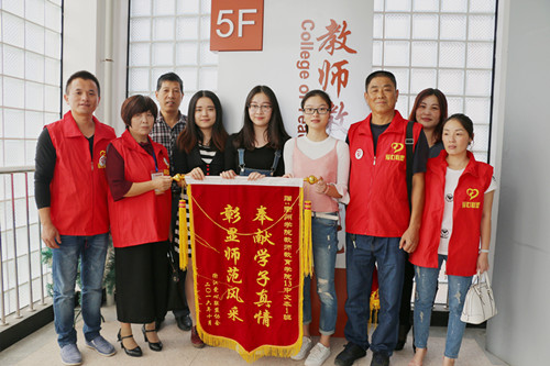 是日,衢江区爱心联盟协会一行十人专程来到我院给13中文本(1)班的全体学生志愿者送来一面红艳艳的锦旗。上书“奉献学子真情,彰显师范风采”金灿灿的大字,感谢13中文本(1)班全体同学两年来的无私奉献。3044am永利集团3044noc党总支书记许玲俊说,“大学生开展志愿活动弘扬了传统美德,再现大学生崇高的精神风貌。我们将一如既往地开展志愿活动,引导学生有担当、有情怀,报效社会。”